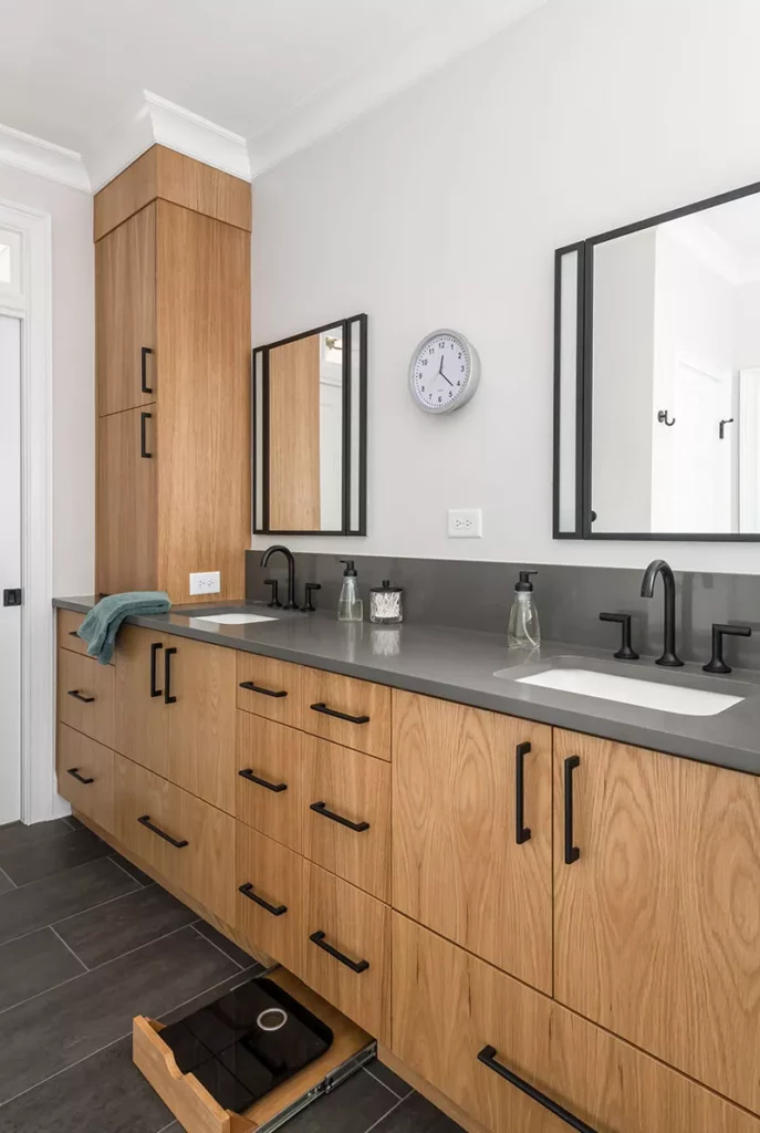 What follows are some of the most functional bathroom storage solutions we’ve employed on our recent projects. These smart bathroom storage solutions include pull-out racks, hidden hampers, integrated trash pull-outs, hair appliance caddies, handy spots for electric toothbrushes, charging drawers, a coffee station and even a bathtub accessories garage.